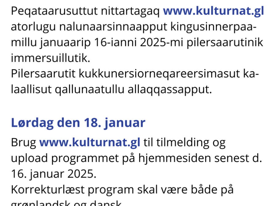 Lørdag den 18. januar. Brug www.kulturnat.gl til tilmelding og upload programmet på hjemmesiden senest d. 16. januar 2025. Korrekturlæst program skal være både på grønlandsk og dansk.